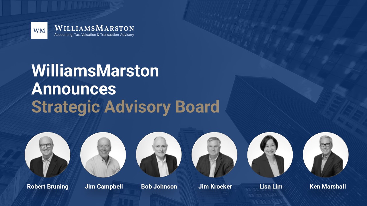 WilliamsMarston, a national leader in complex accounting, tax, valuation, and transaction advisory services, is pleased to announce the launch of its Strategic Advisory Board. This newly established board brings together a group of industry veterans whose collective experience will help shape the firm’s strategic direction, support sustained growth, and advance WilliamsMarston’s mission to be the leading advisory partner to rapidly growing companies across the country.